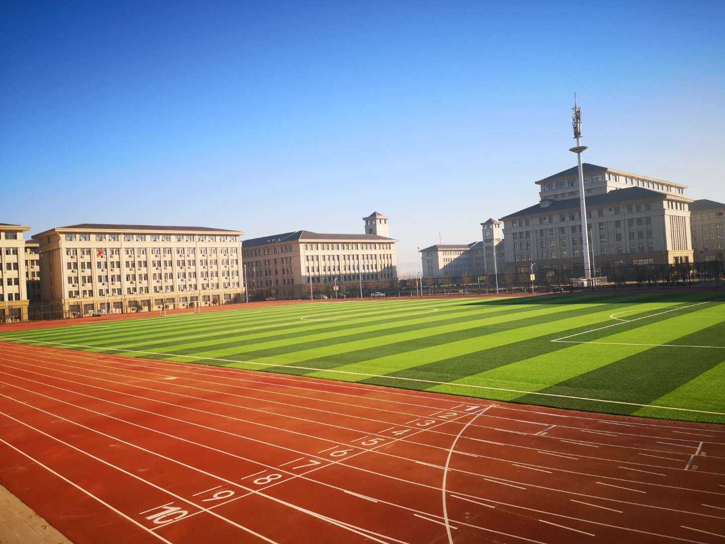 河南林州一中西校區400米標準混合型自結紋跑道、11人制標準足球場、7人制兩個標準足球場、5個標準硅PU籃球場、3個排球場、2個標準網球場全面建設完畢并投入使用。